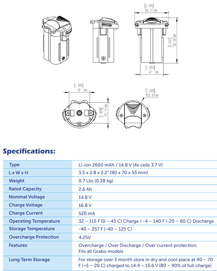 Ogni batteria ad alta capacità garantisce fino a 900 cicli o 1,5 ore di utilizzo continuo ed è compatibile con tutti i modelli GRABO, ad eccezione del GRABO H.