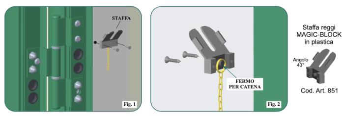 Montaggio staffa reggi-MAGIC-BLOCK (Cod. Art. 851) all’altezza delle cerniere, nella parte interna dell’abitazione mediante le viti in dotazione (vedi figura 1) con l’accortezza, prima di fissare le viti, di inserire nell’apposito fermo la catena del blocco-anta (vedi fig. 2).
