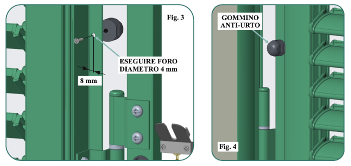 Fissaggio gommino anti-urto in gomma (Cod. Art. 252W1), mediante vite in dotazione, sull’aletta del profilo anta della persiana; si consiglia in una posizione di circa 10 cm verso l’alto dalla posizione di ogni cerniera (vedi figura 4).