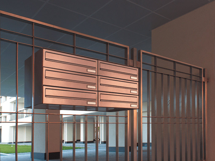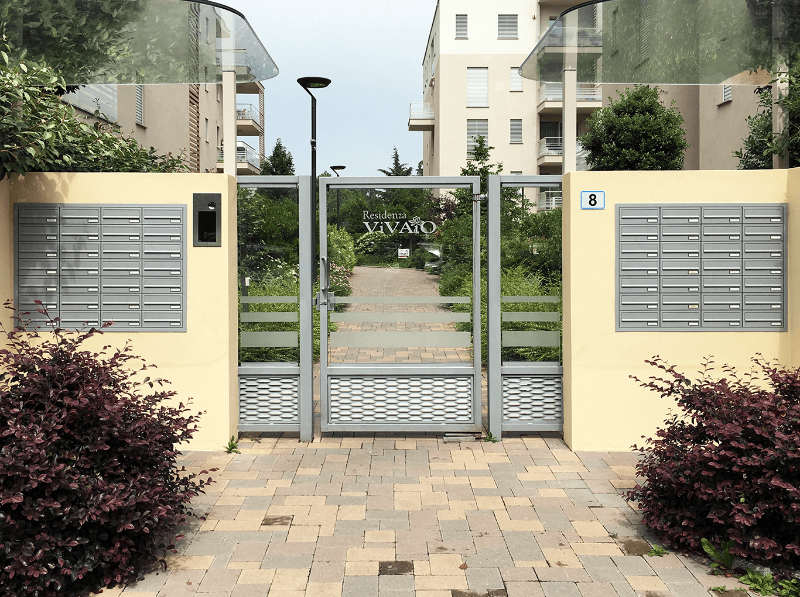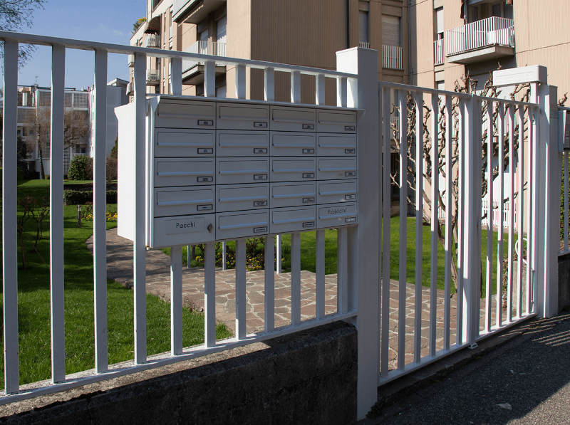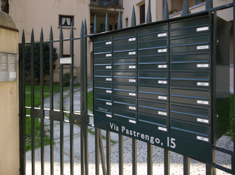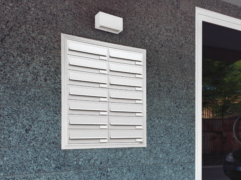 - Lato esterno (introduzione posta) in lamiera d’acciaio zincata e verniciata con feritoia protetta da pateletta in estruso d’alluminio, portanome antivandalismo;