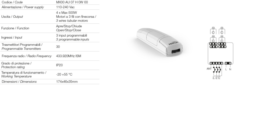 permette il comando di fino a 4 attuatori 230 Vac, ciascuno con potenza massima di 500 W, ed è compatibile con motori a 3 fili con finecorsa. I 3 ingressi filari programmabili possono essere impostati come comando passo-passo, uomo presente oppure per la gestione di sensori meteo. Le funzioni di apertura, stop e chiusura sono completamente configurabili, rendendo il sistema adatto sia ad ambienti residenziali sia professionali.