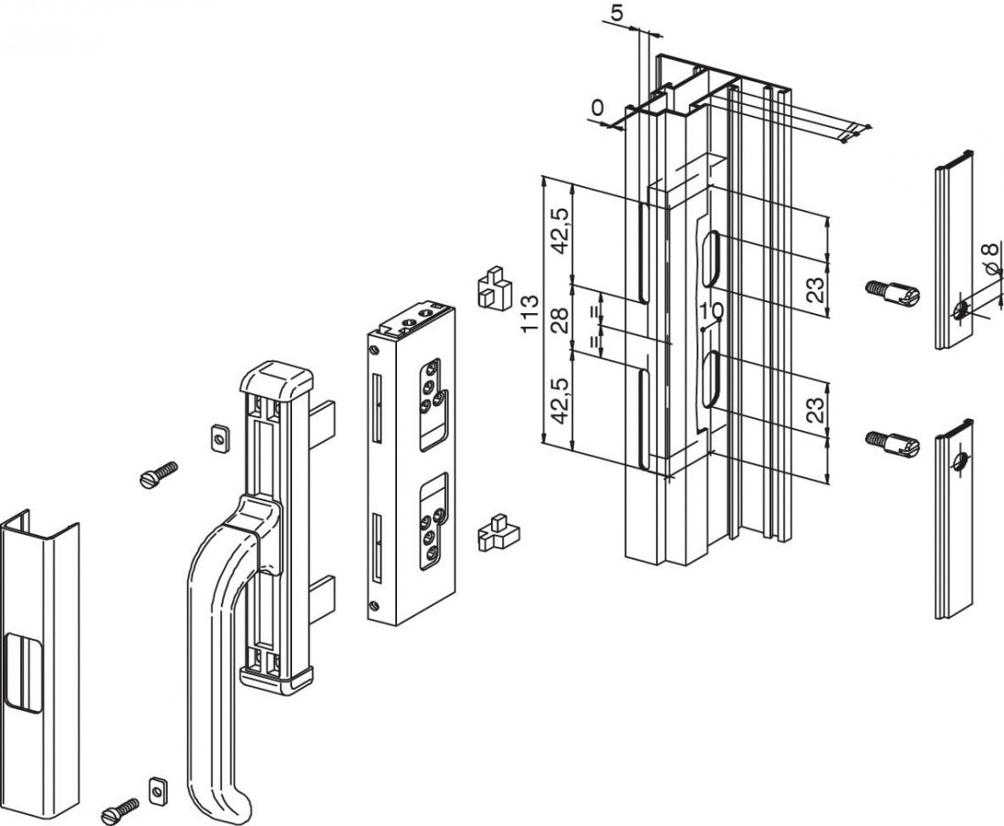 Insieme di particolari per il collegamento della cremonese Giesse Nova con le astine del profilo di una finestra in alluminio con apertura esterna.