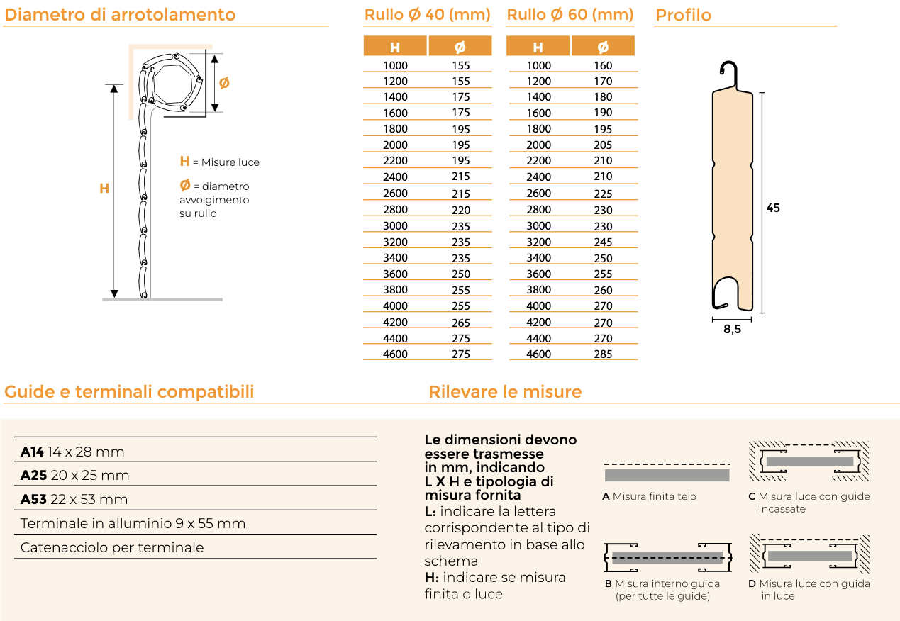 Al momento dell'ordine indica la misura in millimetri di base e altezza (specificando se la misura dell'avvolgibile è finita o vano).