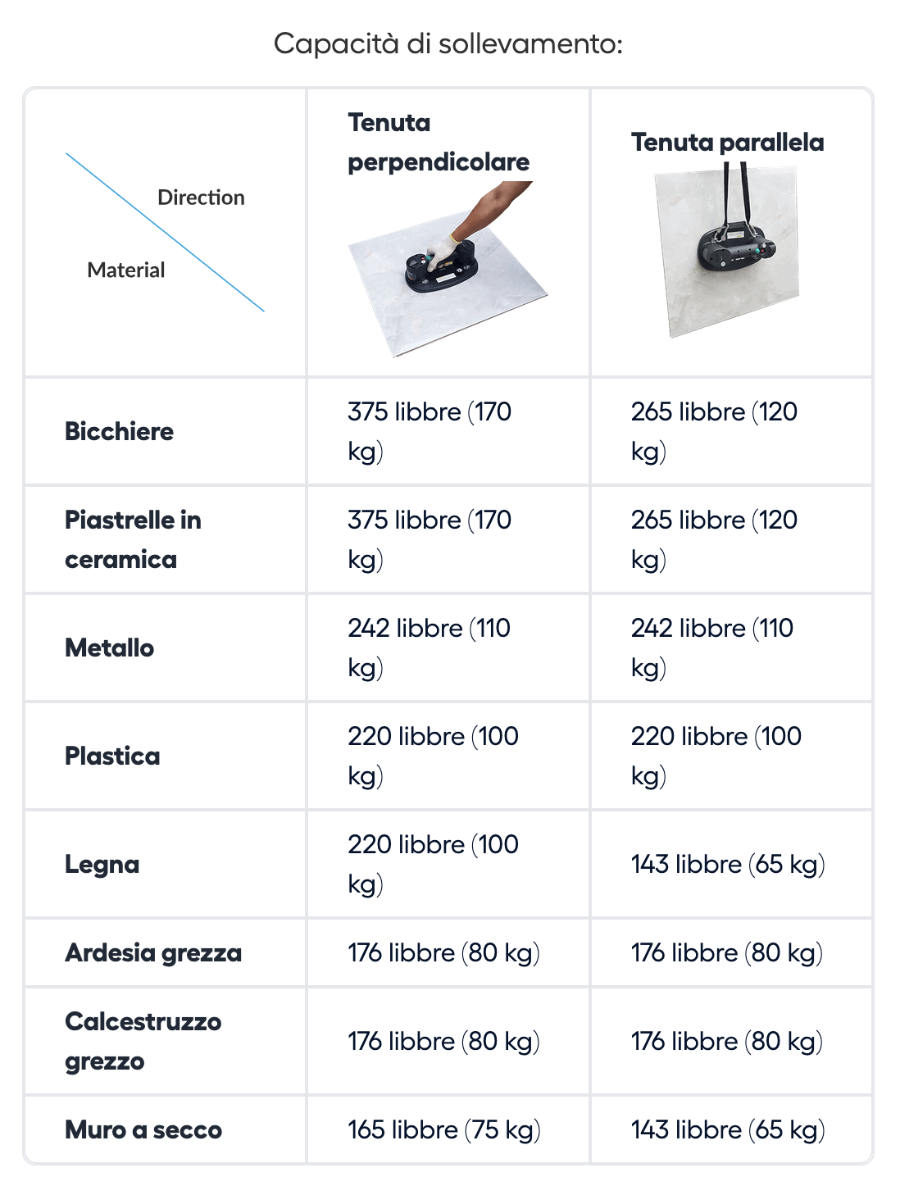 Fino a 170 kg di capacità su superfici lisce non porose.