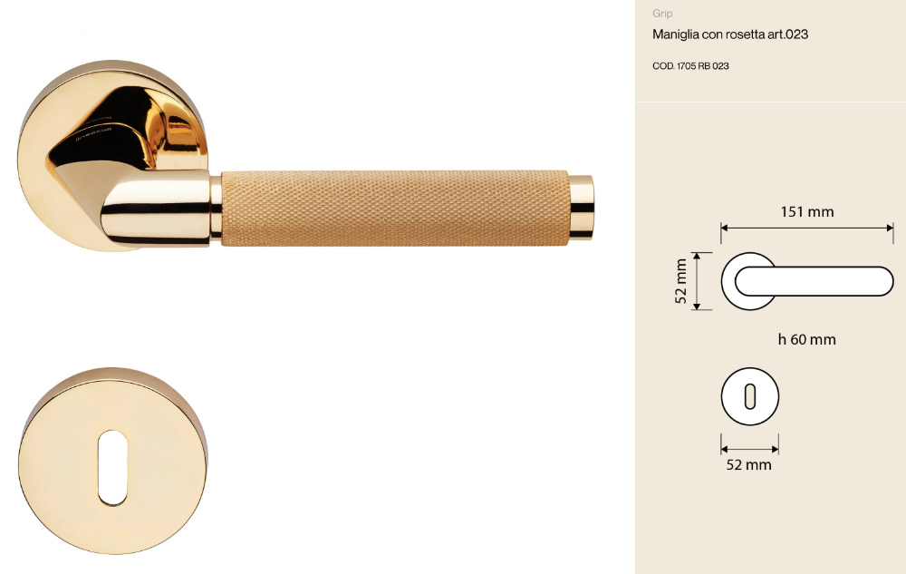 Disponibile in diverse finiture – dal raffinato oro zecchino al nero opaco tecnico, fino al moderno cromo lucido – la Grip si adatta a ogni ambiente, sposandosi sia con porte classiche pantografate che con soluzioni più minimal e contemporanee.