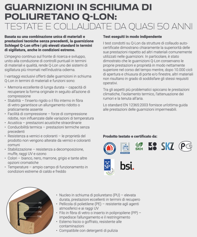 Conformi alla norma EN 12365:2003, le guarnizioni Q-LON sono la scelta ideale per chi cerca tenuta all'aria e all'acqua, isolamento termico e riduzione del rumore, con un prodotto certificato e durevole nel tempo.