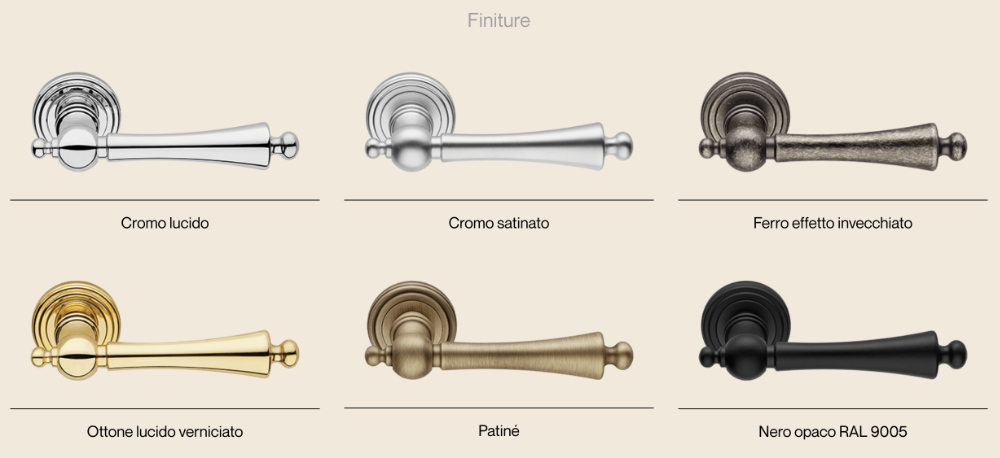 Versatilità negli abbinamenti: perfetta su porte in essenza (noce, ciliegio, rovere) nelle finiture calde come ottone lucido, oppure su porte moderne in laccato bianco o nero nella finitura nero opaco.