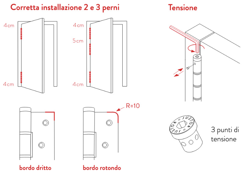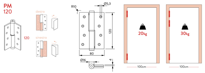 - Per 3 unità installate: larghezza porta 100 cm, peso porta 30 kg, numero di cicli 250.000.