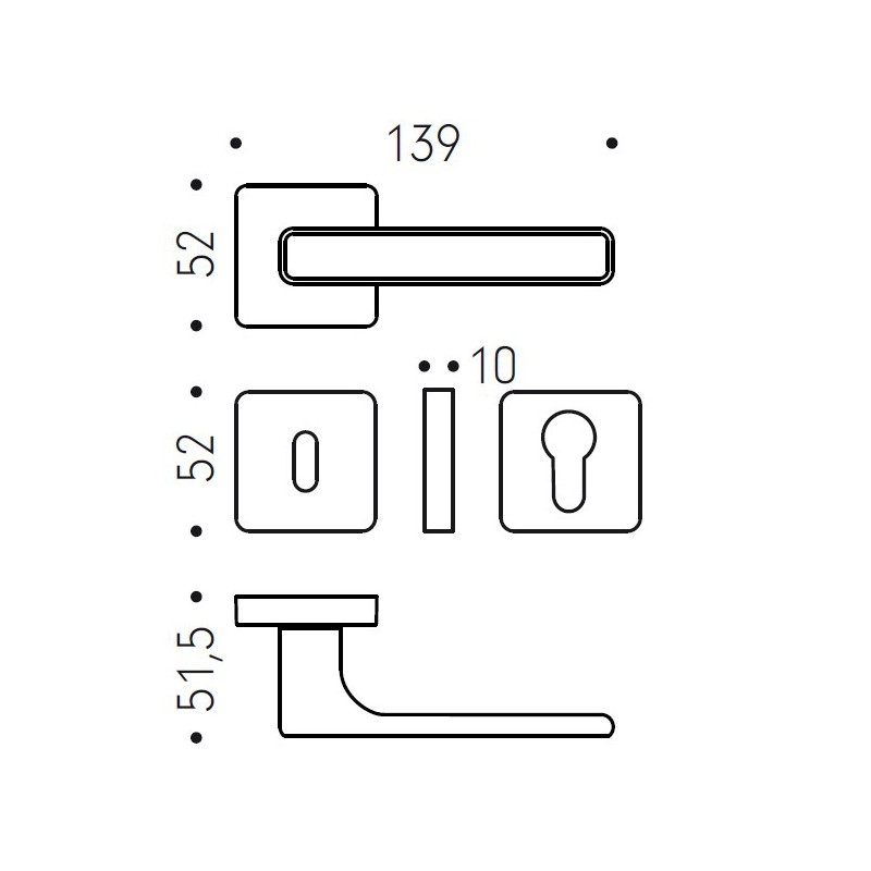 Dimensioni: lunghezza 139 mm – rosetta 52x52 mm – spessore 10 mm.