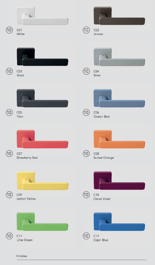 Realizzata in ottone e proposta con rosetta quadrata, è ordinabile in una ricca gamma di finiture colorate, ideali per dare personalità e coerenza a qualsiasi progetto di arredo.