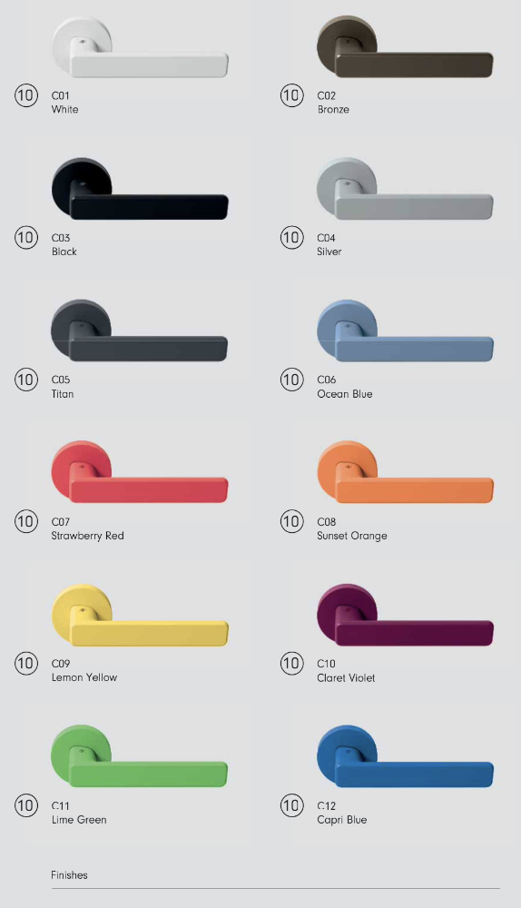 La collezione è proposta con rosetta tonda e in numerose finiture colorate dai toni intensi, ideali per arricchire qualsiasi ambiente e integrarsi con diversi stili di interior design.