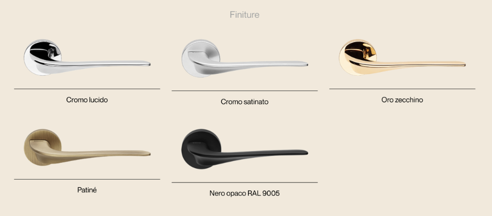 Ordinabile online su Windowo in cinque finiture – cromo lucido, cromo satinato, oro zecchino, patiné e nero opaco RAL 9005 – si adatta con naturalezza a ogni contesto d’arredo, dal più moderno al più raffinato.