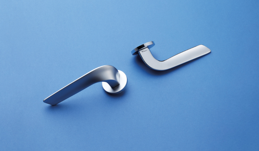 L’impugnatura sottile e allungata si distingue per il suo volume estroflesso, che crea raffinati giochi di luce e ombra a seconda dell’inclinazione. La parte superiore, piatta e pulita, contrasta armoniosamente con la parte inferiore più scolpita, dando vita a un effetto visivo di grande dinamismo.