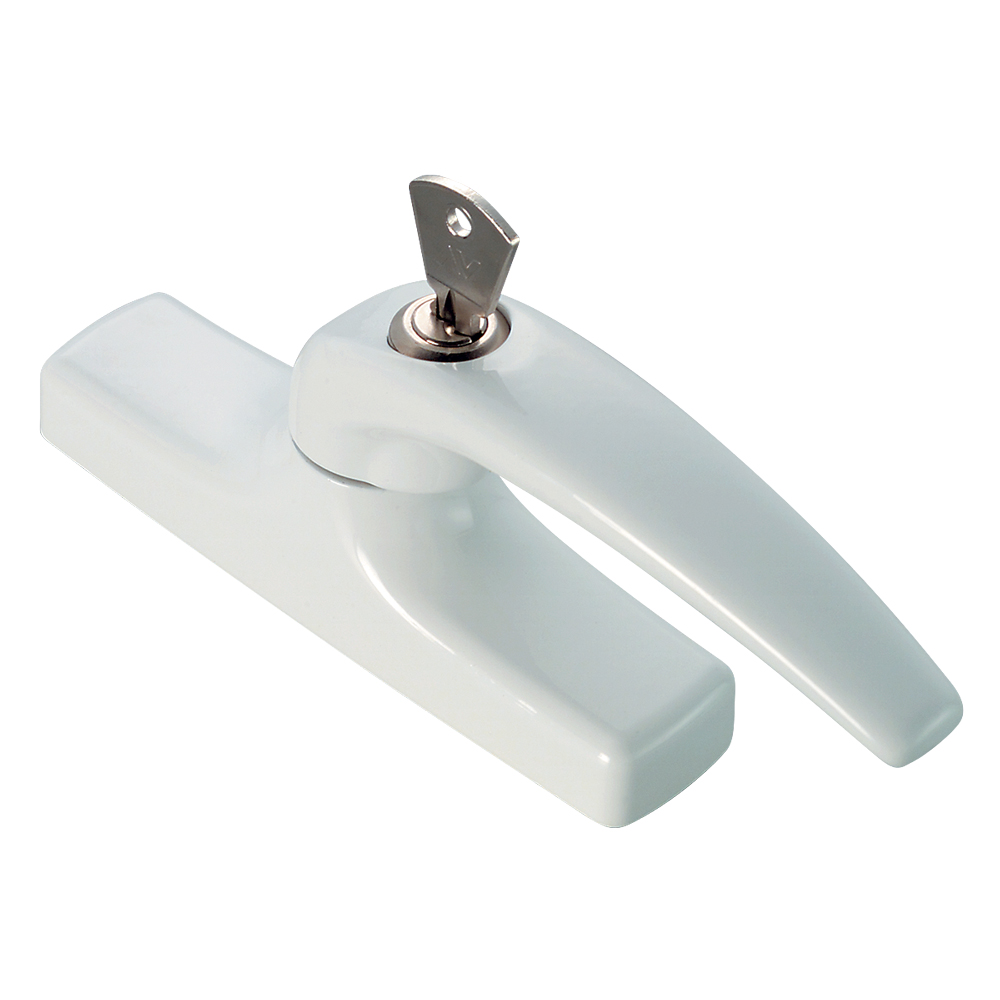 Maniglia per finestra cremonese Manon Savio in metallo pressofuso o in ottone, con cilindro di sicurezza (chiavi uguali), interassi mm 84.5-98, 2 viti TORX® (T15) TC M5x13 in acciaio inox (OTT: conf. 5 pz. e 2 viti TORX® T15 TC M5x10).