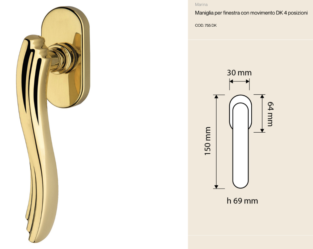 Marina Linea Calì maniglia per finestra DK 4 posizioni: ottone made in italy, impugnatura ergonomica stratificata, finitura a scelta (seleziona la variante). Modello classico che non stanca, con ergonomia studiata.
