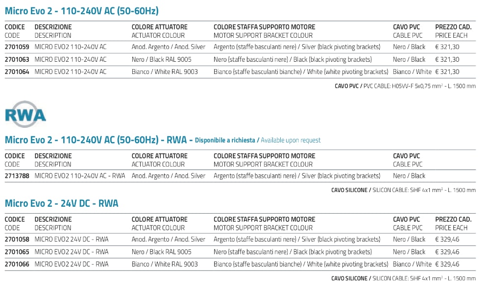 - Voltaggio: 110-240V AC (50/60Hz) o 24V DC (versione RWA);