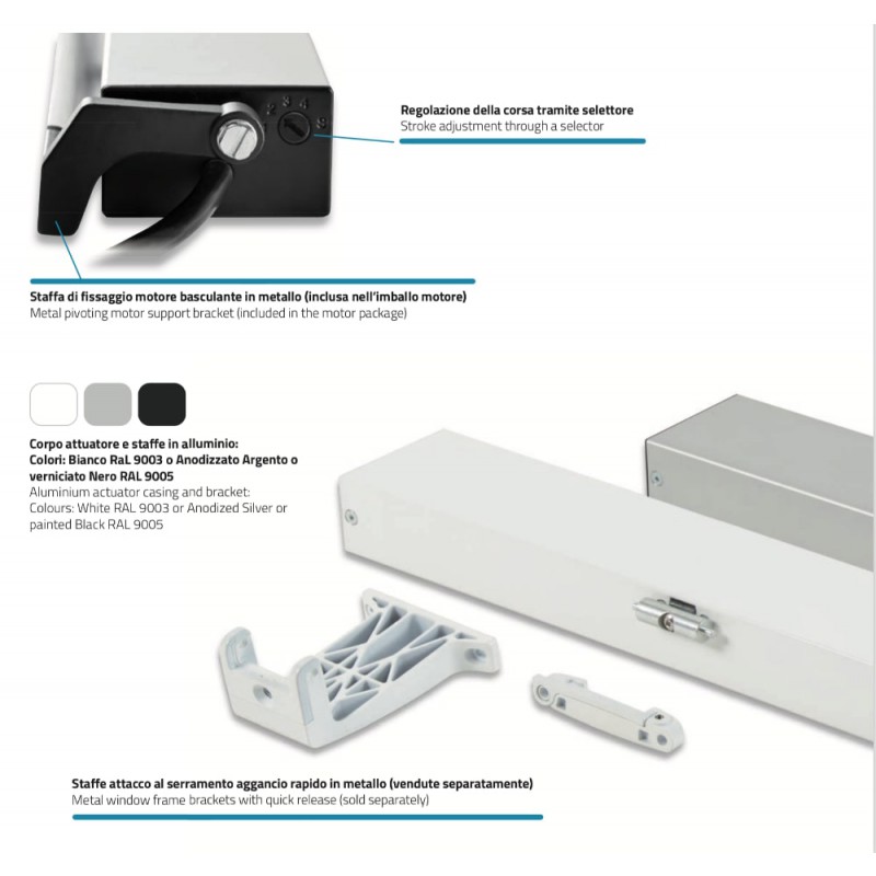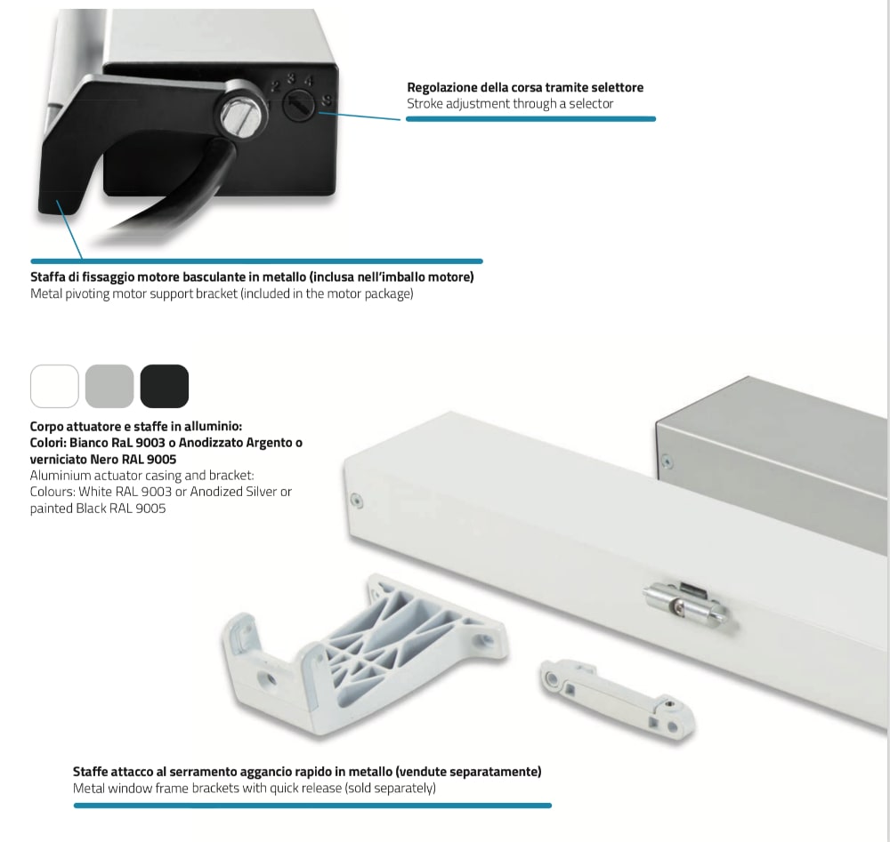 - Staffe attacco al serramento vendute separatamente (su finestra a sporgere, a vasistas o supporto motore basculante).