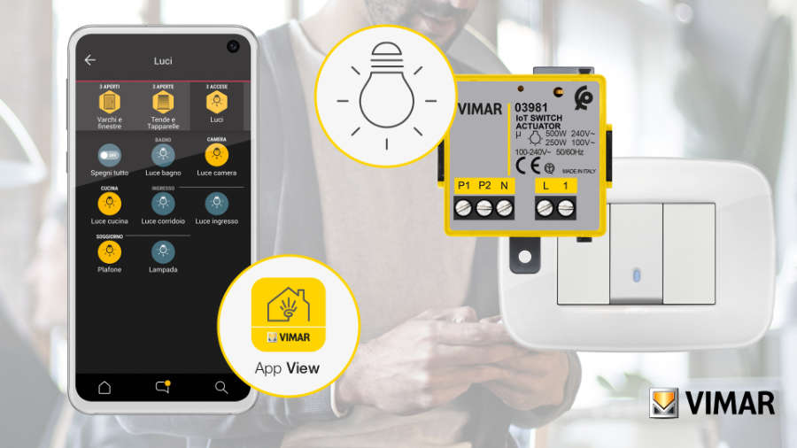 Apparecchio di comando elettronico IoT con uscita a relè NO 100-240 V 50/60 Hz per lampade ad incandescenza 500 W, lampade LED 100W, trasformatori elettronici 250 VA, lampade fluorescenti 120 W, controllo da remoto, 1 ingresso per comando filare per richiamare uno scenario, doppia tecnologia IoT su standard Bluetooth 5.0 per realizzazione sistema mesh VIEW Wireless e su standard Zigbee 3.0, alimentazione 100-240 V 50/60 Hz,