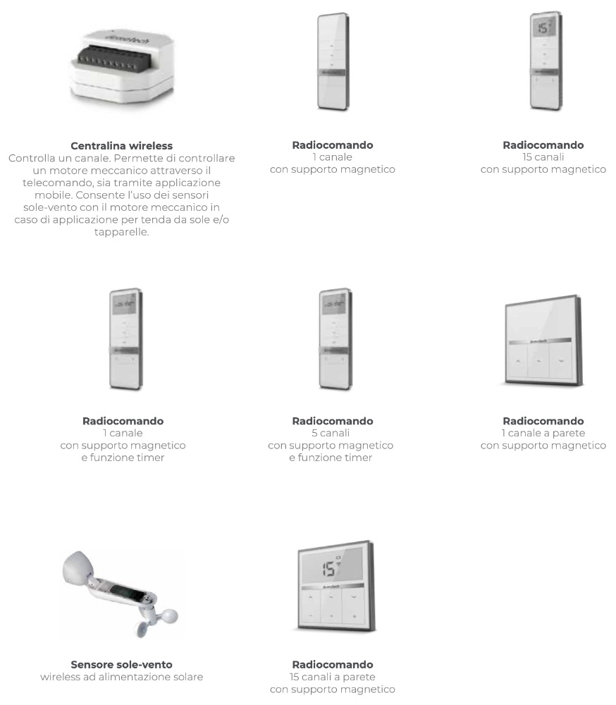 catalogo motori per tapparelle e tende da sole a marchio Domotech include motori meccanici, radio, elettronici 3° stop, oltre a radiocomandi, centraline, HUB Wi-Fi, sensori sole-vento e accessori di montaggio.