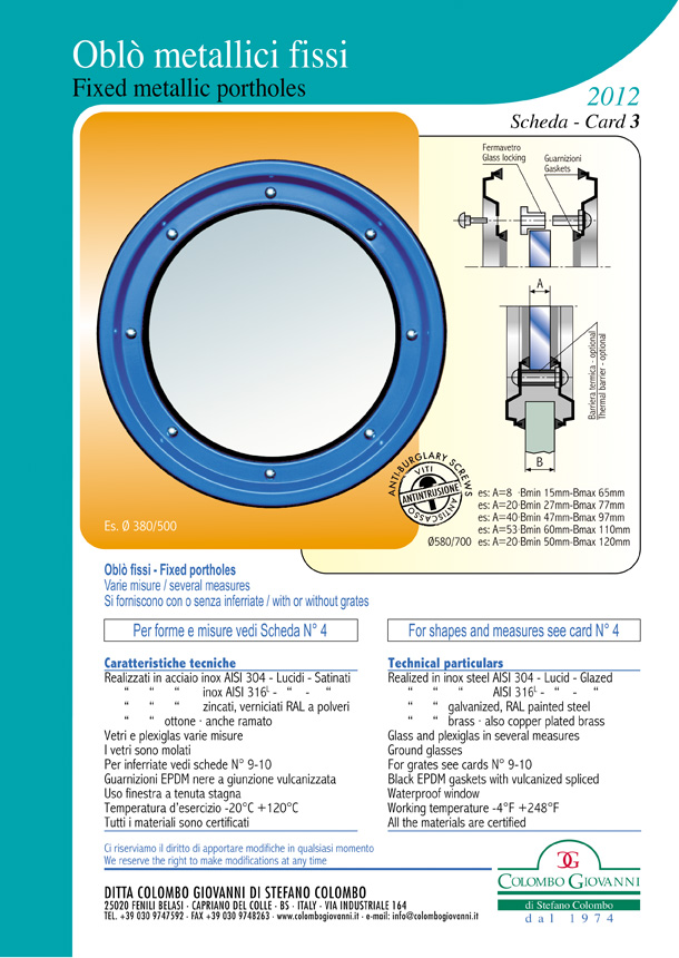 La ditta fornitrice progetta e costruisce i prodotti migliorandone costantemente la qualità. Fin dalla progettazione di questi oblò, l'obiettivo è quello di raggiungere la massima soddisfazione dei clienti recependone le precise esigenze.