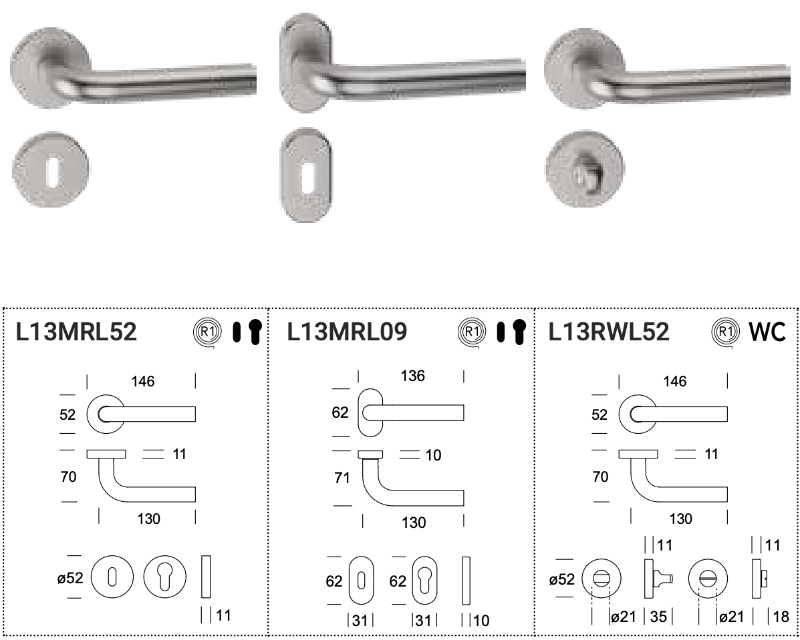 - Maniglia con rosetta Ø52x10 mm e con bocchette foratura patent o yale;