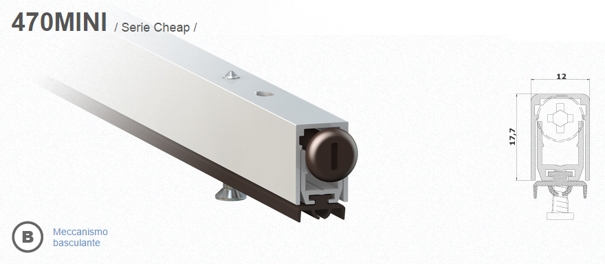 Paraspiffero Comaglio 470 Mini Serie Basic con meccanismo a singola regolazione (vite F: discesa): garantisce un movimento controllato del profilo mobile con guarnizione.