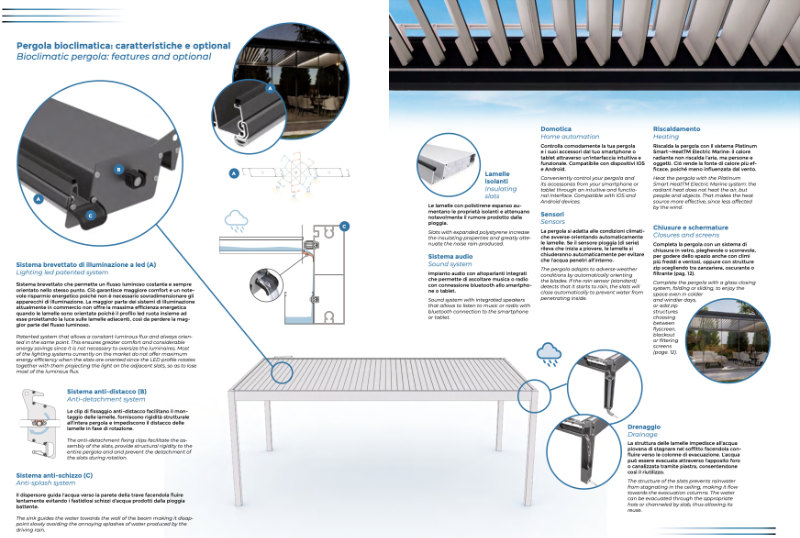 Il suo stile raffinato e contemporaneo, unito alla solida struttura in alluminio dotata di un soffitto composto da lamelle regolabili, assicura resistenza e difesa dall'ambiente esterno, comfort ottimale all'interno e la capacità di creare un microclima personalizzato, regolando l'apporto di aria e luce secondo necessità.