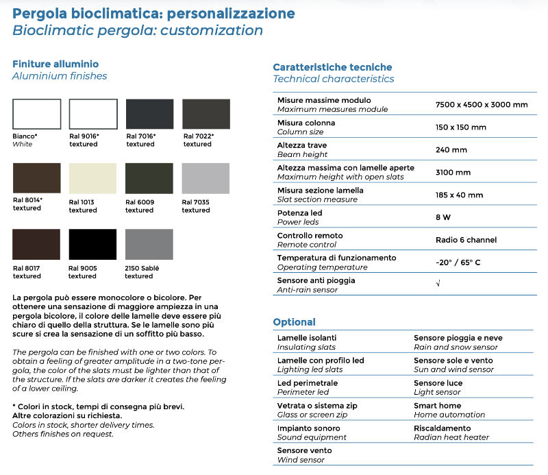 Pergola bioclimatica Velia Effezeta System: caratteristiche tecniche e optional