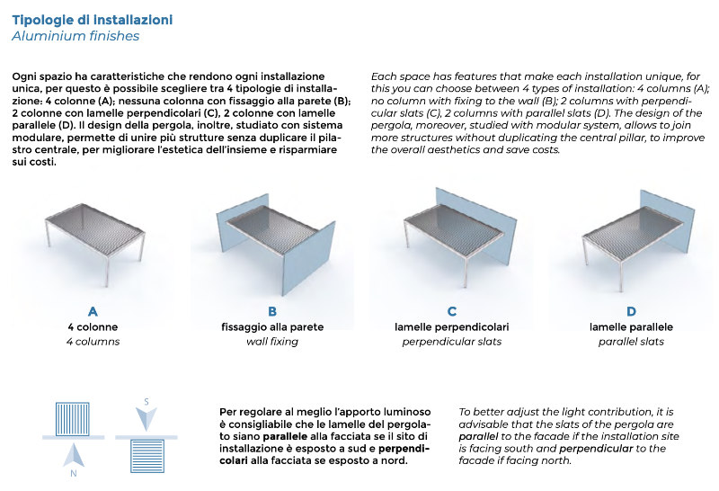 Ogni spazio ha caratteristiche che rendono ogni installazione unica, per questo è possibile scegliere tra 4 tipologie di installazione: 4 colonne (A); nessuna colonna con fissaggio alla parete (B); 2 colonne con lamelle perpendicolari (C), 2 colonne con lamelle parallele (D). Il design della pergola, inoltre, studiato con sistema modulare, permette di unire più strutture senza duplicare il pilastro centrale, per migliorare l’estetica dell’insieme e risparmiare sui costi.