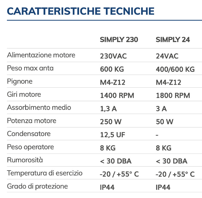 Caratteristiche tecniche motore cancello SIMPLY VDS