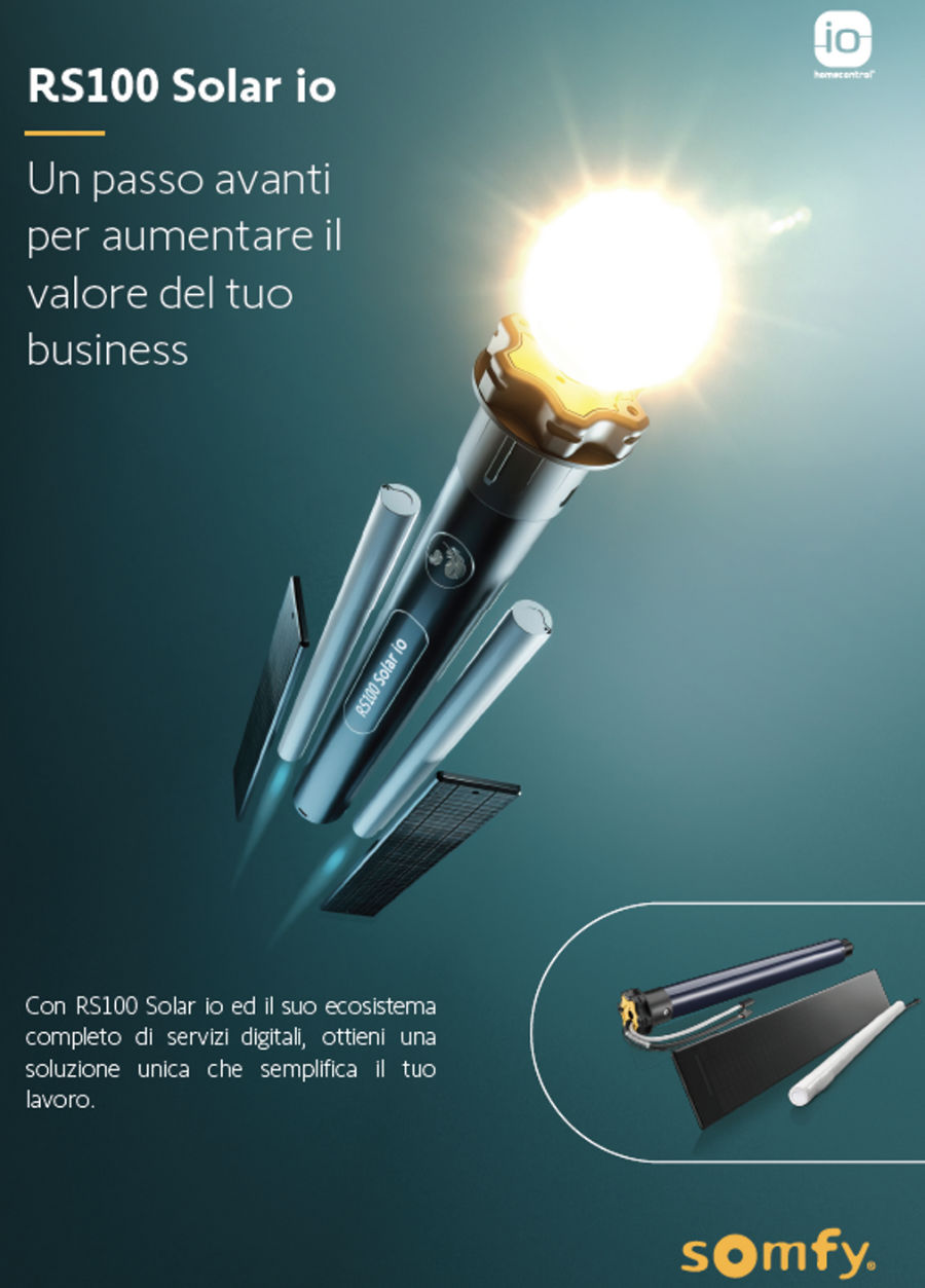 La linea di motori per tapparelle RS100 io di Somfy si arricchisce con l'aggiunta di una nuova versione alimentata autonomamente tramite energia solare.