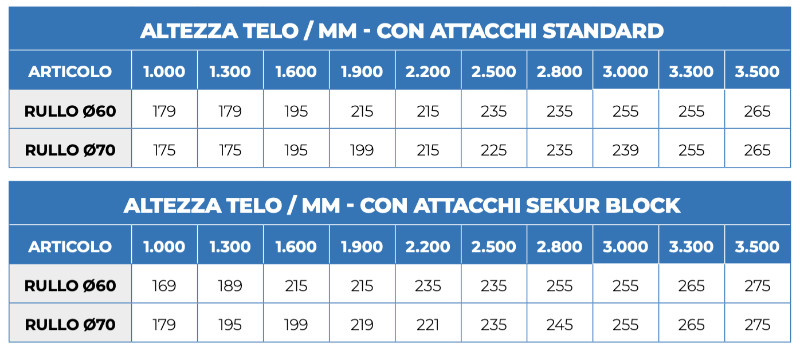*Larghezza massima (solo telo) riferito a classe 1 secondo norma CE.
