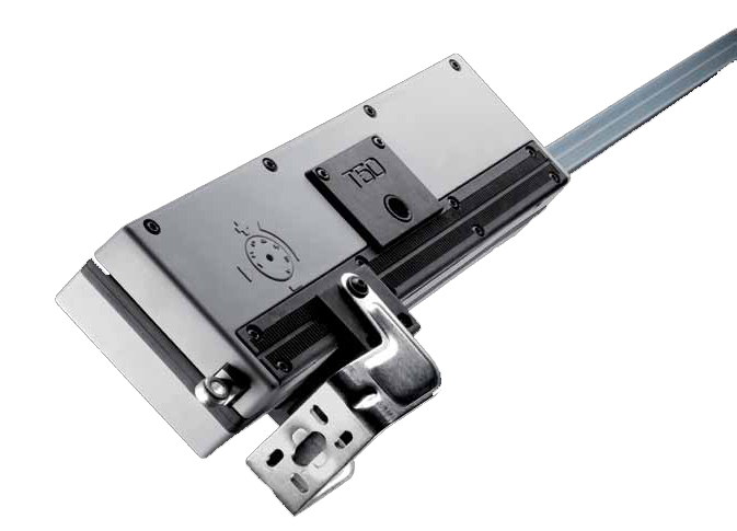 Attuatore lineare elettrico Topp modello T50 24V con movimento basculante autoallineante, a cremagliera.