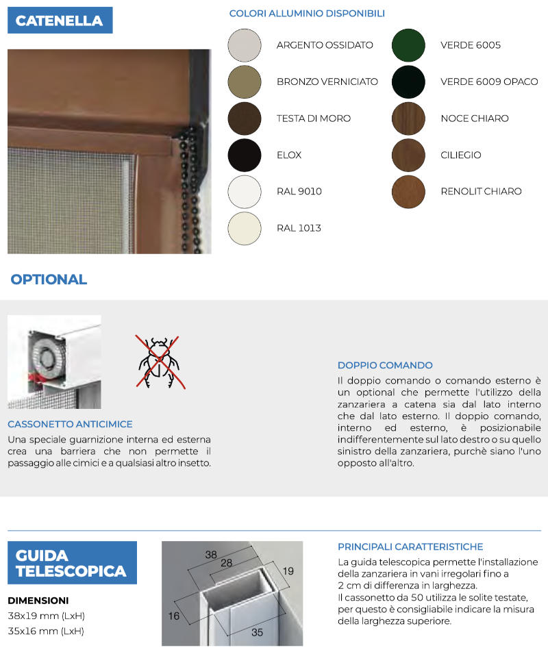 - Optional su richiesta: guida telescopica, cassonetto anticimice, doppio comando e maggiorazione rete nera (contattaci se interessato);