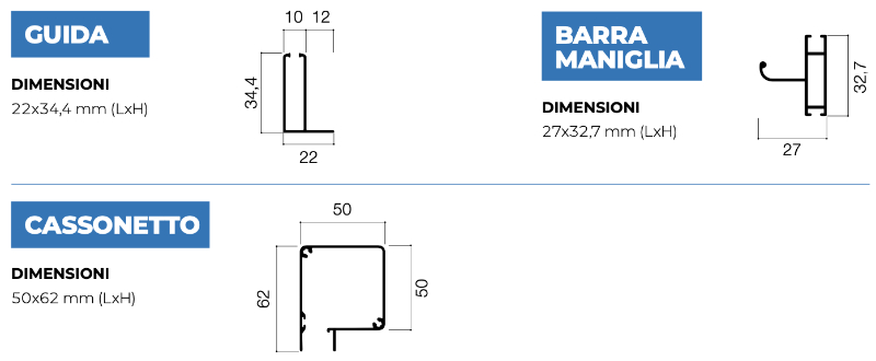 - Dimensioni massime: cassonetto da 50 mm 200x260 cm;