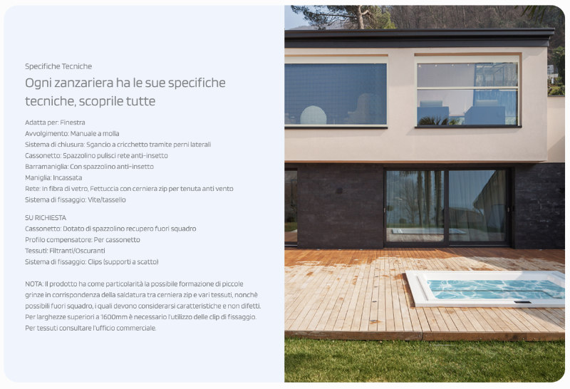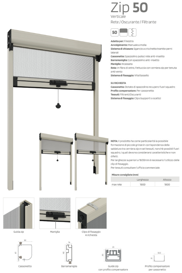 Nota: il prodotto ha come particolarità la possibile formazione di piccole grinze in corrispondenza della saldatura tra cerniera zip e vari tessuti, nonchè possibili fuori squadro, i quali devono considerarsi caratteristiche e non difetti. Per larghezze superiori a 1600mm è necessario l’utilizzo delle clip di fissaggio.
