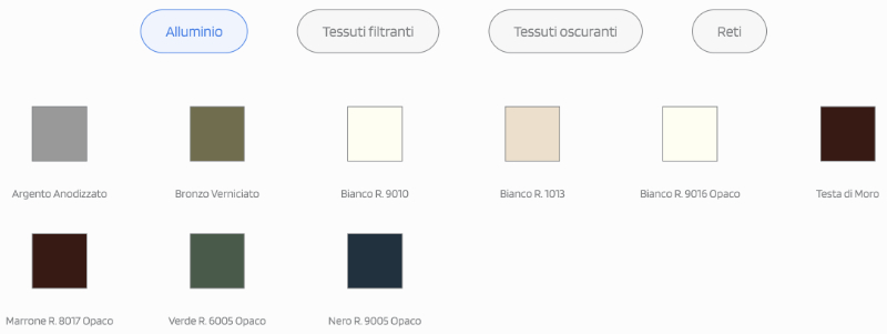 Gamma colori: il produttore di zanzariere Officine Rami offre un’ampia gamma di colori. I colori rappresentati hanno un valore puramente indicativo e non possono in alcun caso essere considerate come tinte di riferimento per eventuali difformità di colore rispetto a quelli reali.
