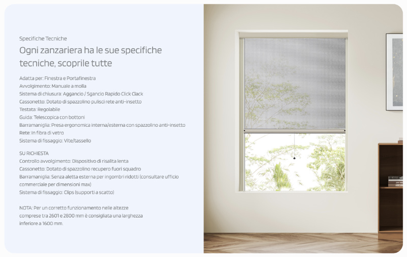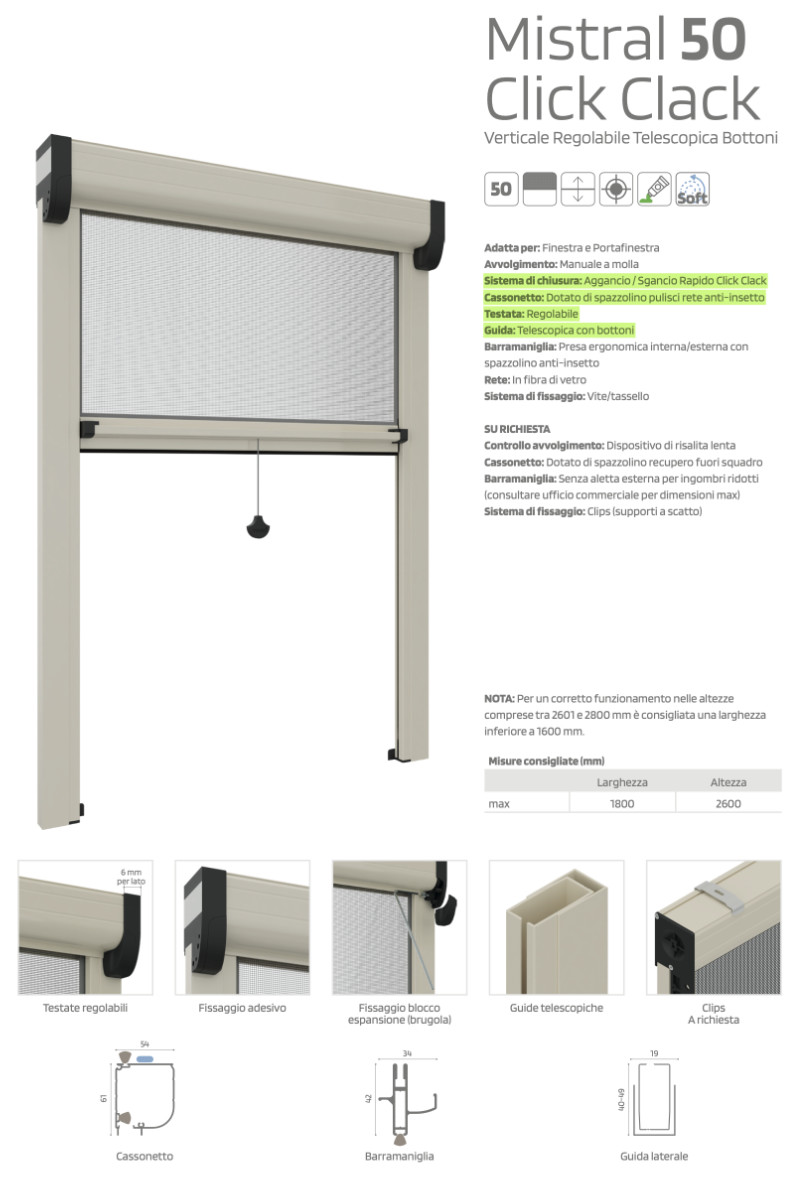 Questo modello verticale, denominato Mistral 50 Click Clack, è caratterizzato da un design regolabile e telescopico, che lo rende adattabile a diverse misure e tipologie di aperture. La praticità d'uso è assicurata dal sistema di avvolgimento manuale a molla, che permette una gestione semplice e immediata del prodotto.
