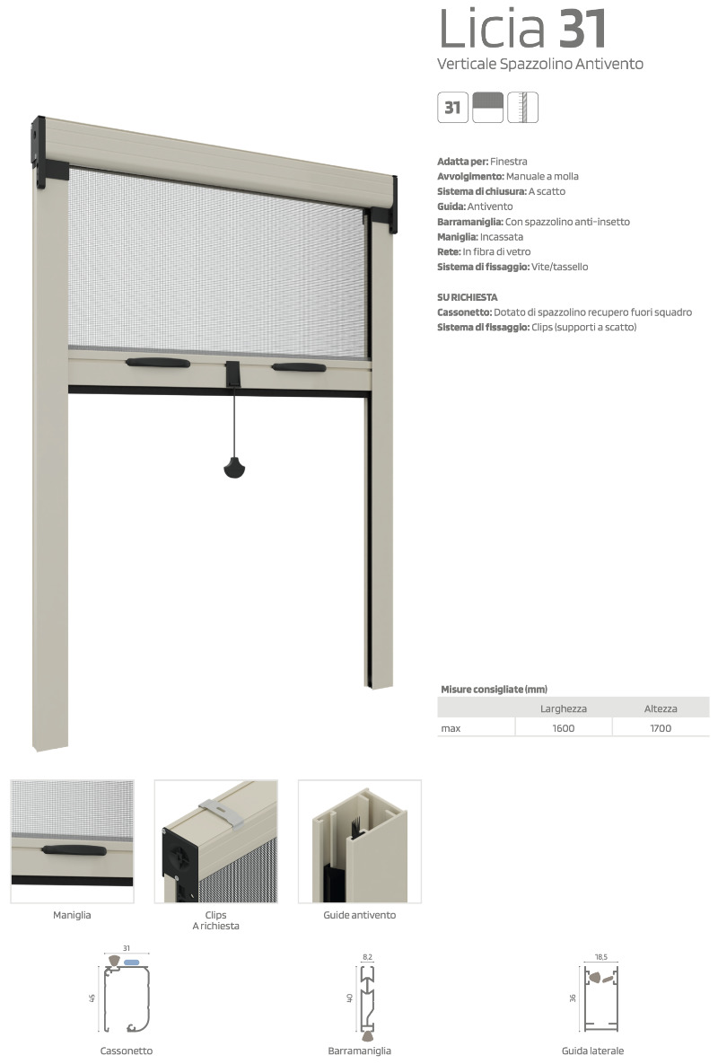 Licia 31 Verticale Officine Rami: la zanzariera sottile e a ingombro ridotto, ideale per finestre, che combina un design elegante e minimale con un'avanzata funzionalità, inclusi avvolgimento manuale a molla e sistema di chiusura a scatto.
