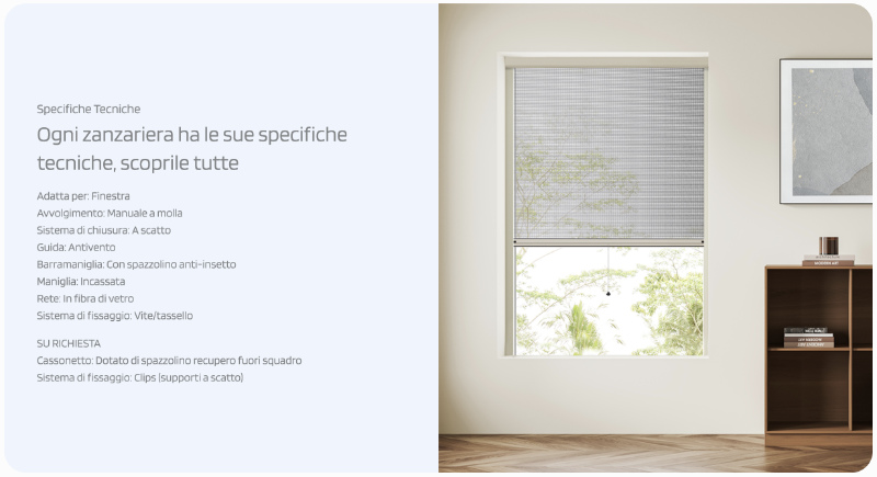 Ottimizzazione dello spazio: grazie al suo design compatto, una zanzariera sottile a ingombro ridotto è ideale per spazi ristretti. Questo la rende perfetta per piccoli ambienti o per finestre dove lo spazio è limitato;