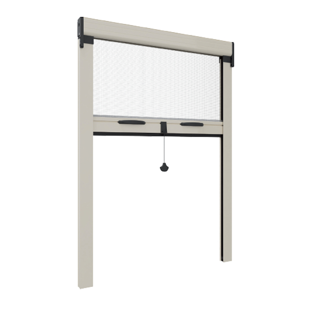 Zanzariera per finestra, con avvolgimento manuale a molla e sistema di chiusura a scatto.