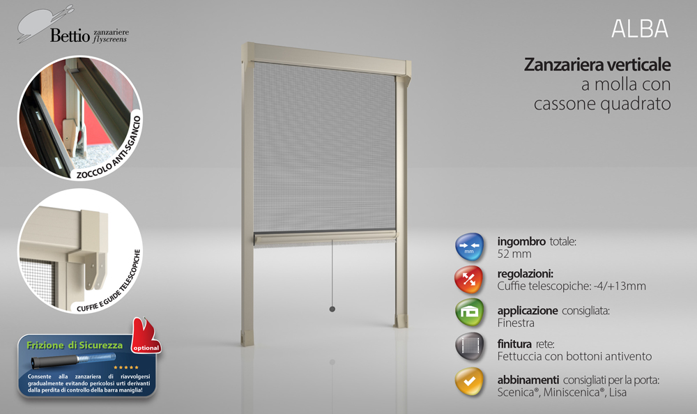 Alba Bettio, zanzariera verticale a molla con cassone quadrato e cuffie telescopiche